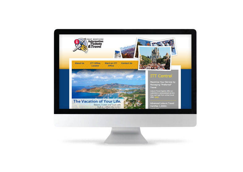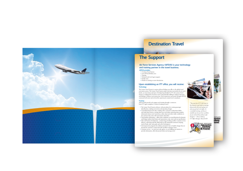 Now that we had the basics of ITT’s brand identity nailed down, it was time to get proactive and begin the marketing strategy. esd created ITT’s web presence. The site’s navigation was simple and its content aimed to prospective ITT base partners and military families searching for a vacation time travel agent. Four key areas guided prospects to learn more about the program, locate the nearest ITT office, start their own ITT office or directly contact ITT. In addition to the basic 4-1-1 and the top 10 reasons to join the ITT base family, the site featured dynamic, custom-made videos..and a lot of them!