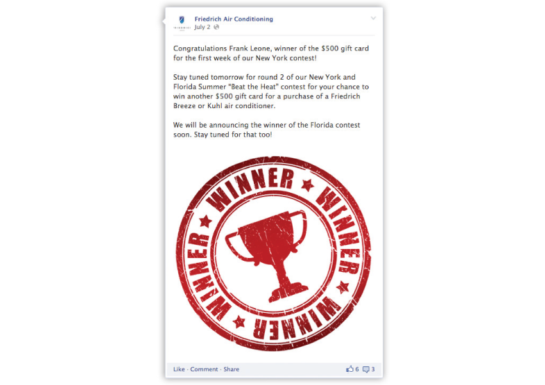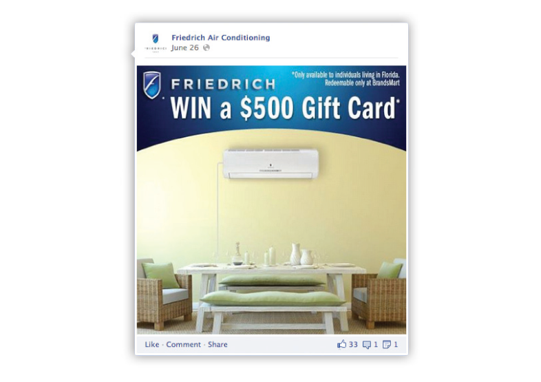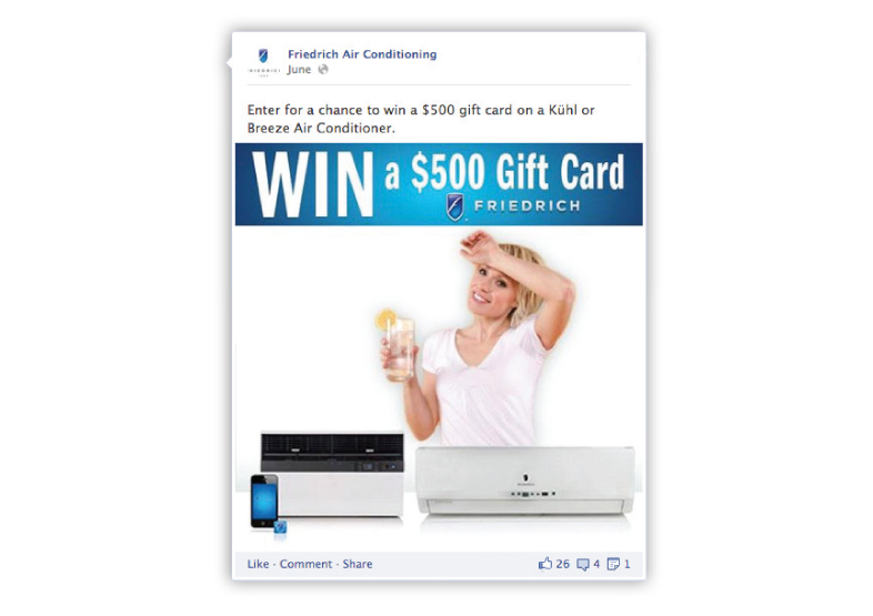esd developed a campaign through social media to grow this community of leads and to generate a quick online buzz around the Friedrich brand. We created a Facebook ad campaign that included both fan ads and promoted post ads to drive more people to the contest. We tracked analytics daily, allowing us to make small tweaks: