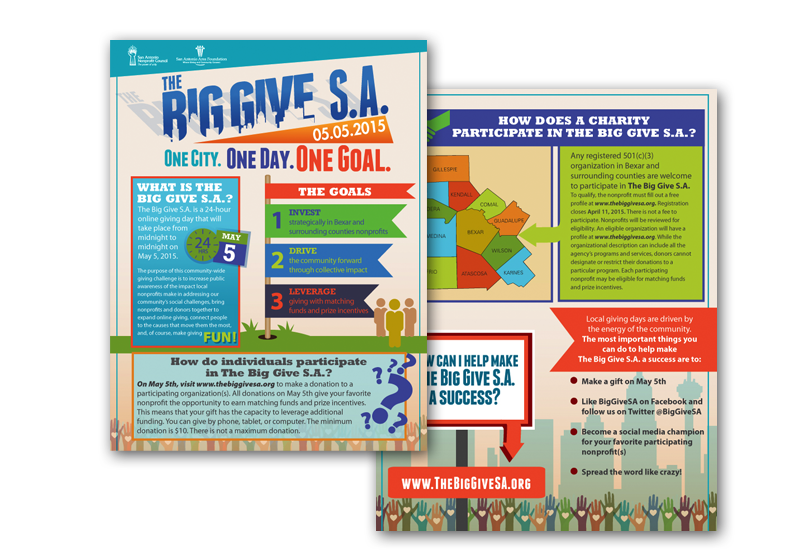 The San Antonio Nonprofit Council and San Antonio Area Foundation planned to host San Antonio’s first Big Give S.A. event on May 6, 2014. Based on a national day of giving called Give Local America, The Big Give S.A. is a 24-hour day of giving for any Bexar County nonprofits interested in participating. Although Austin had held a successful Big Give in 2013, this was the first time most of the local community had heard of it. The group had a goal of raising $1 million for hundreds of local nonprofits. To accomplish this goal, The Big Give S.A. needed an integrated solution to introduce it to the city and encourage as many organizations and individual to participate as possible to ensure it would become an annual occurrence.