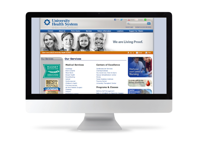 Did you know University Health System (UHS) is the top-ranked hospital in the San Antonio metro area, one of the best hospitals in the country in two specialties (urology and nephrology), and the only Level 1 trauma center in South Texas? Few people noticed these amazing achievements and the array of services this public hospital and teaching facility – a world-class healthcare institution located in the heart of San Antonio that cares for thousands of indigent and emergency cases every year – accomplishes for its community every day. These facts were hidden behind a website sorely in need of an update. Understanding that the web is the first place people look for information about a healthcare institution required an approach that gave equal weight to the many services UHS provides its wide variety of constituents, from emergency patients to healthcare professionals looking for a job. Among the challenges esd faced: